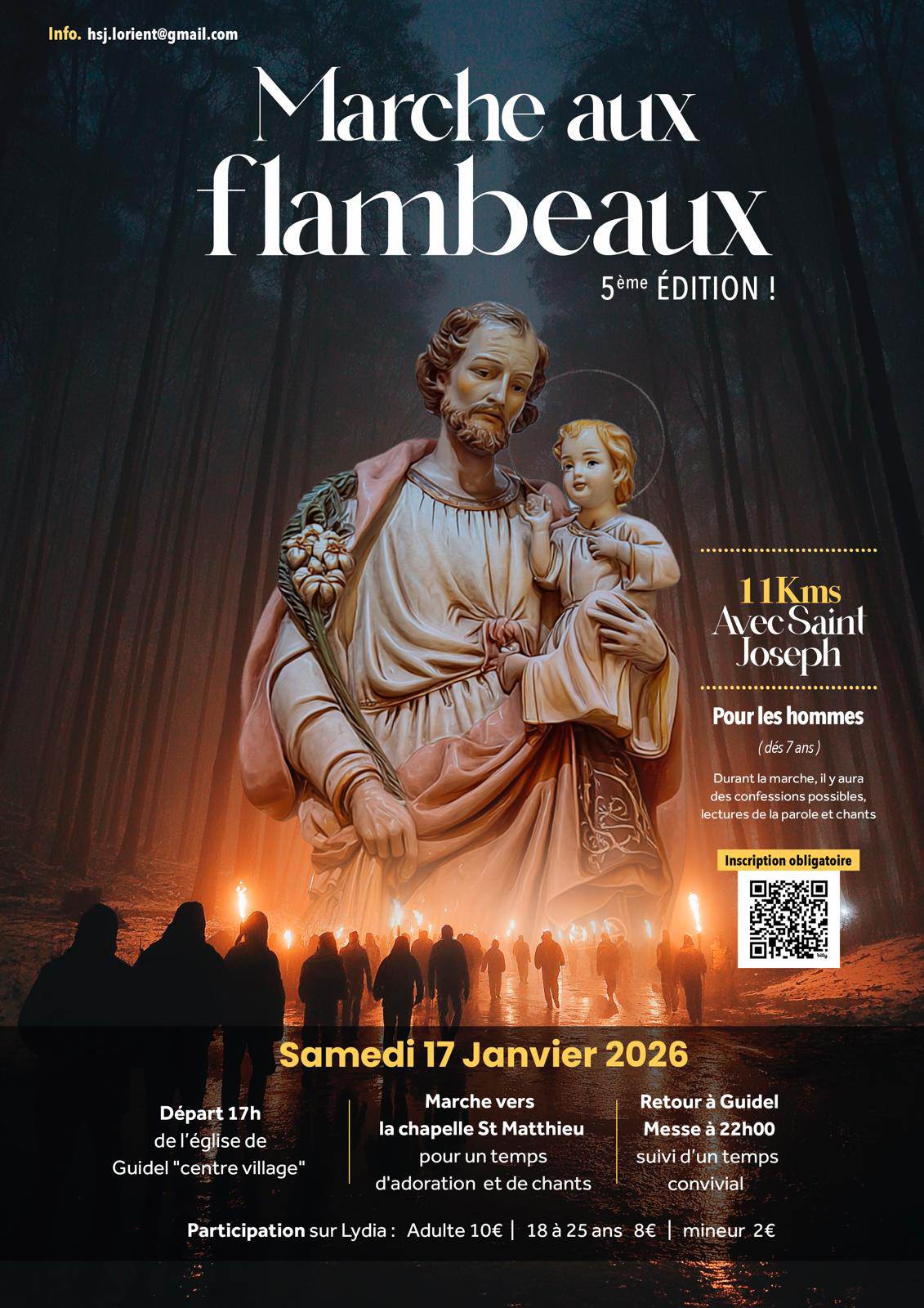 Samedi 17 janvier, marche aux flambeaux de 11 kms avec Saint Joseph, réservée aux hommes. Durant la marche, confessions possibles, lecture de la Parole de Dieu et chants. Départ 17h de l’église de Guidel, marche vers la chapelle Saint Matthieu, retour à Guidel avec la messe à 22h suivie d’un temps convivial. Inscription obligatoire auprès de Benoit Genuyt (06 69 92 94 43) et Sébastien Fauchille (06 60 70 76 64).