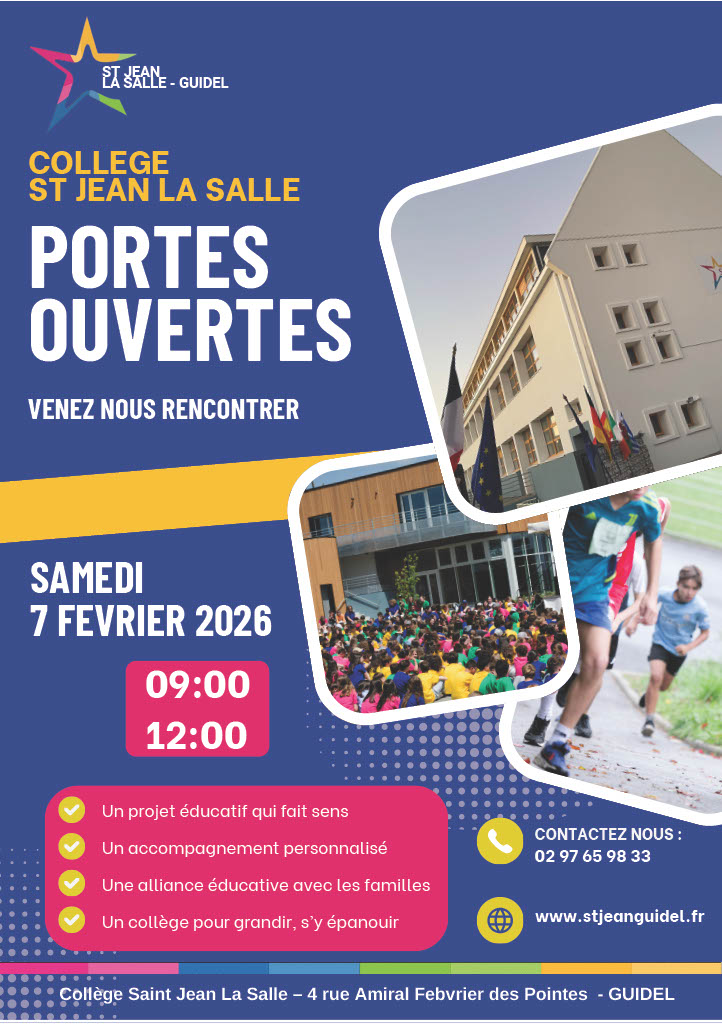 Portes ouvertes au Collège St Jean La Salle Publié parIsabelle HODY15 janvier 202616 janvier 2026Publié dansActualités Samedi 7 février 2026, de 9h00 à 12h00, le collège St Jean La Salle de Guidel ouvrent ses portes.
