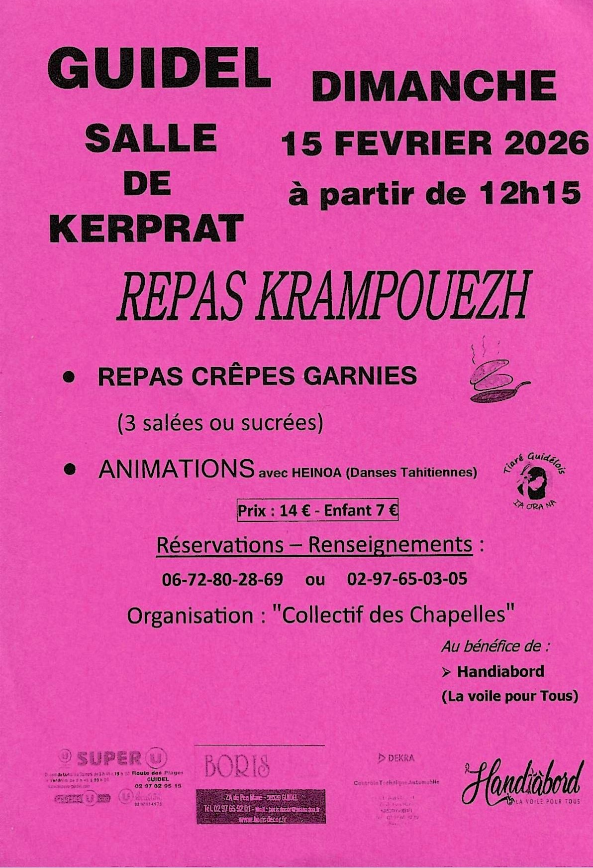 Dimanche 15 février, le Collectif des Chapelles de Guidel vous invite à son repas Krampouezh organisé au bénéfice de l’association « Handiabord » (La voile pour Tous). https://www.handiabord.com/