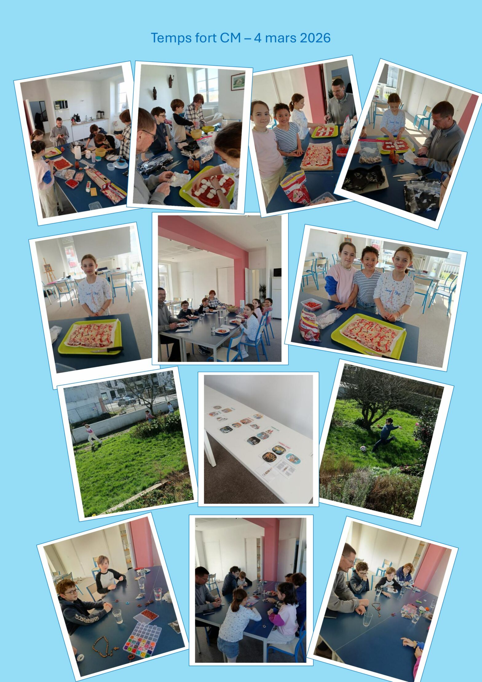 « Durant la journée, nous avons étudié la semaine sainte sous forme de film, jeux, enseignement. Nous avons pris un temps d’adoration eucharistique et vécu le sacrement de réconciliation à l’église. Nous avons cuisiné ensemble et partagé le repas, fabriqué un dizainier et sous un beau soleil, les enfants ont joué dans le jardin. »