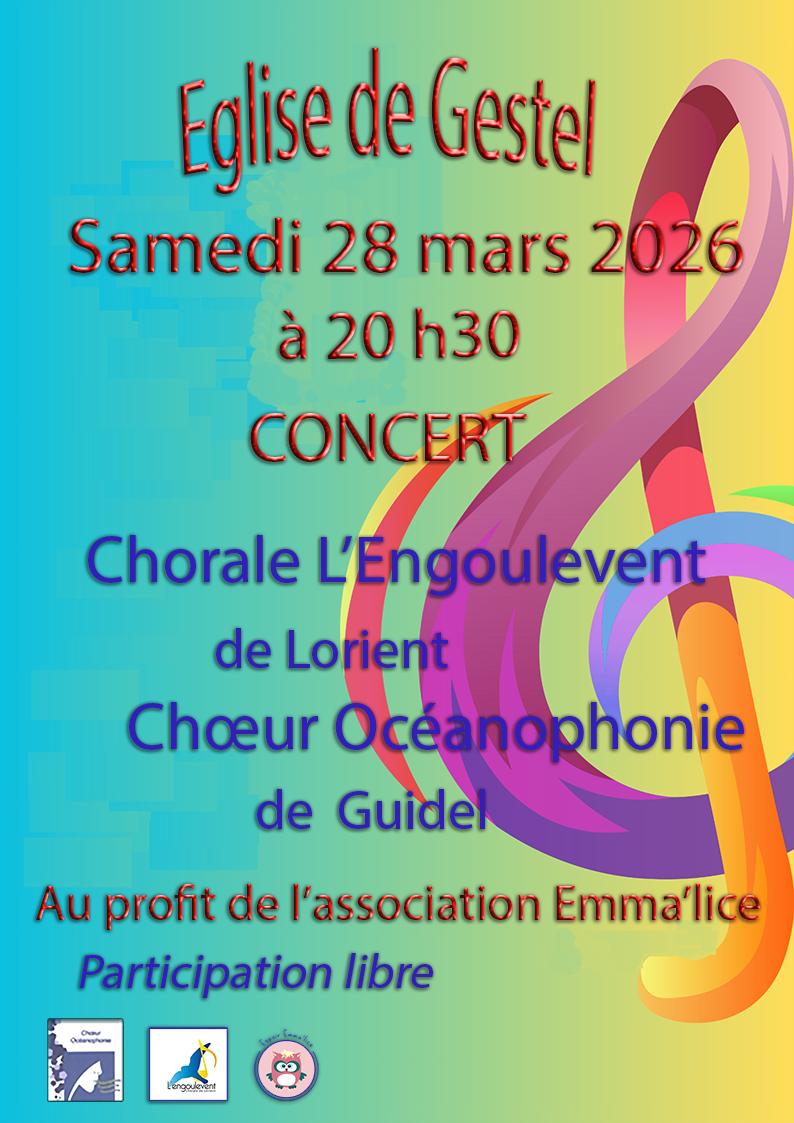 Concert église de Gestel Publié parIsabelle HODY22 mars 202622 mars 2026Publié dansNon classé Samedi 28 mars à 20h30, église de Gestel, Océanophonie et l’Engoulevent s’unissent au profit d’Emma’lice.