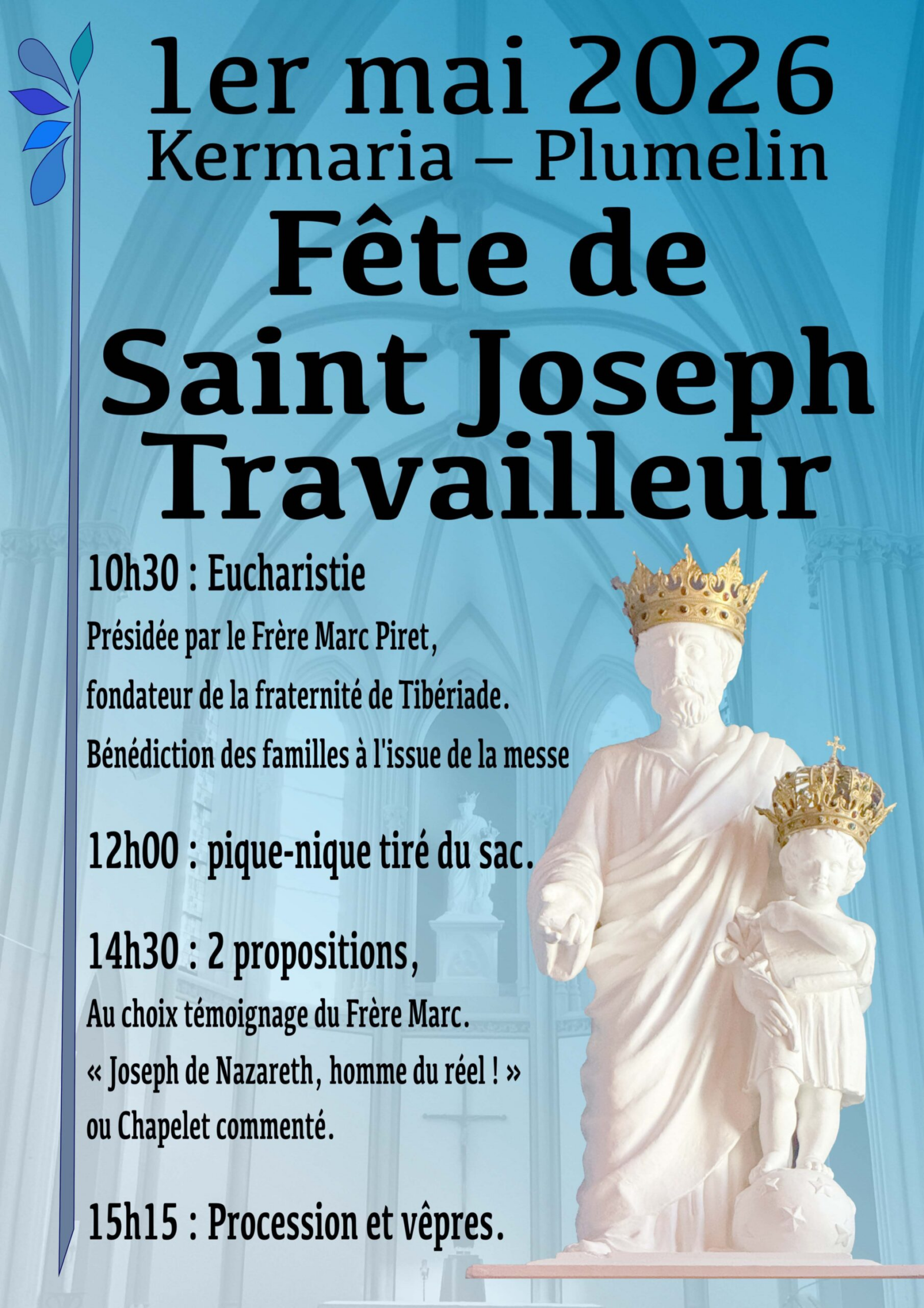 Vendredi 1er mai 2026, la congrégation des Filles de Jésus, présente sur notre paroisse, invite les fidèles à la rejoindre à sa maison-mère de Kermaria, en Plumelin, pour fêter en famille Saint Joseph travailleur, saint patron de leur congrégation.
