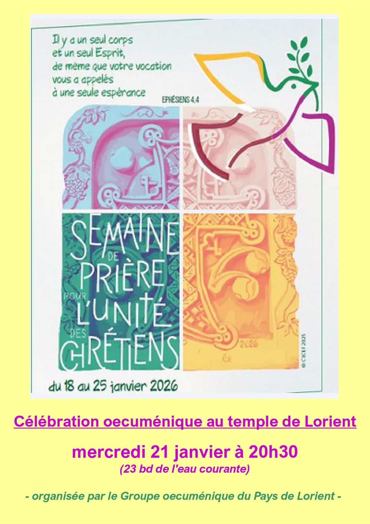 Mercredi 21 janvier à 21h30, célébration oecuménique au temple de Lorient. Du 18 au 25 janvier 2026, comme chaque année, le principal temps fort œcuménique demeure la « Semaine de prière pour l’unité chrétienne » qui, depuis 1908, rassemble des chrétiens de toutes confessions.